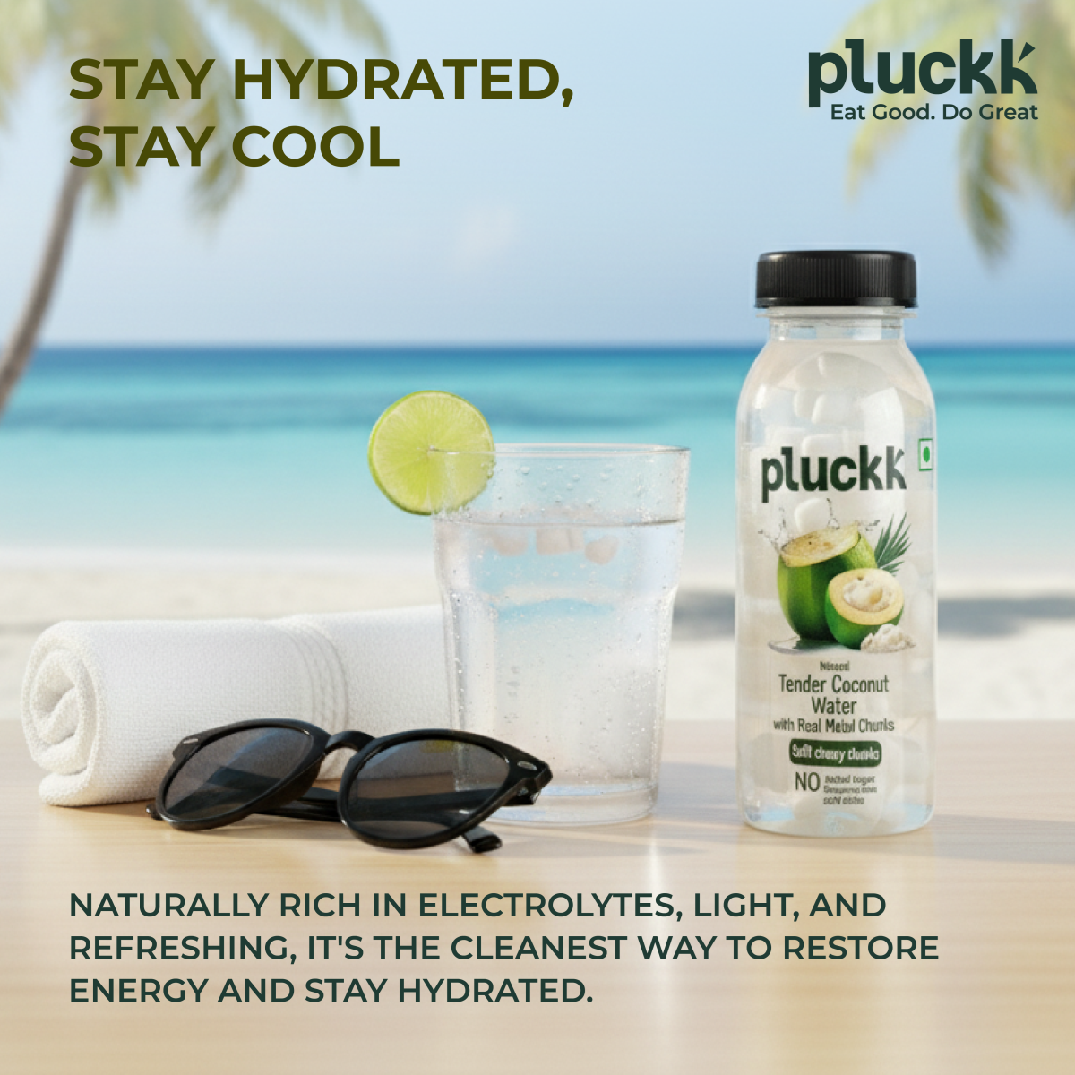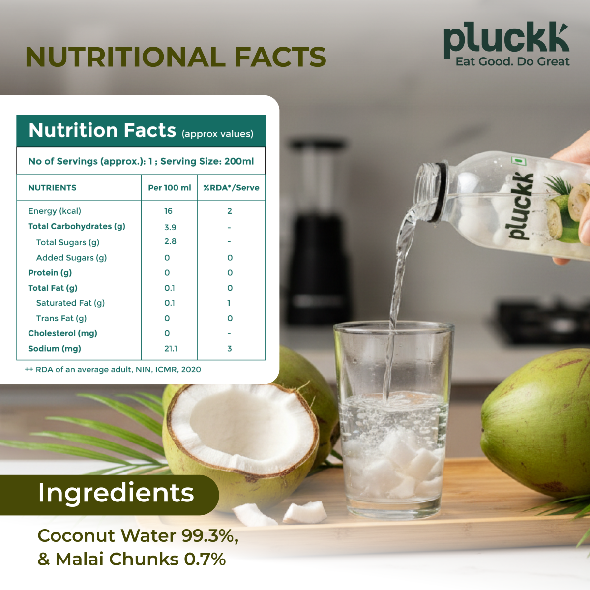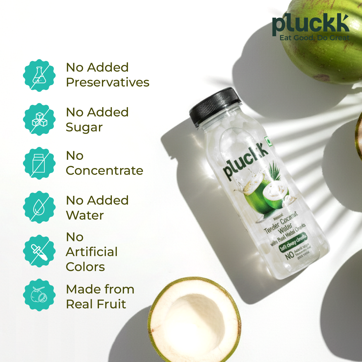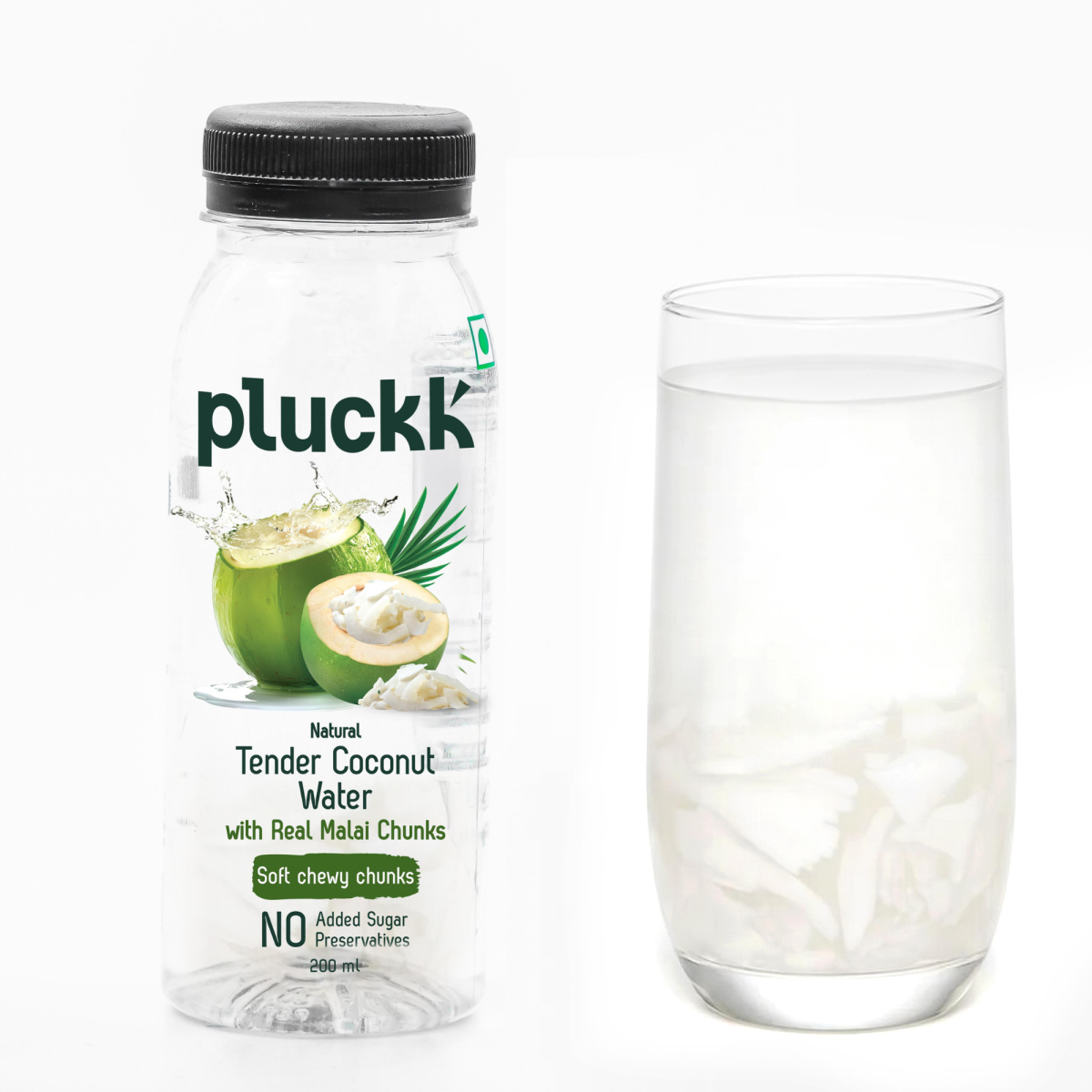 Believe it or not, Pluckk’s Tender Coconut Water with malai chunks is made with just one ingredient, natural coconut water and absolutely nothing else.