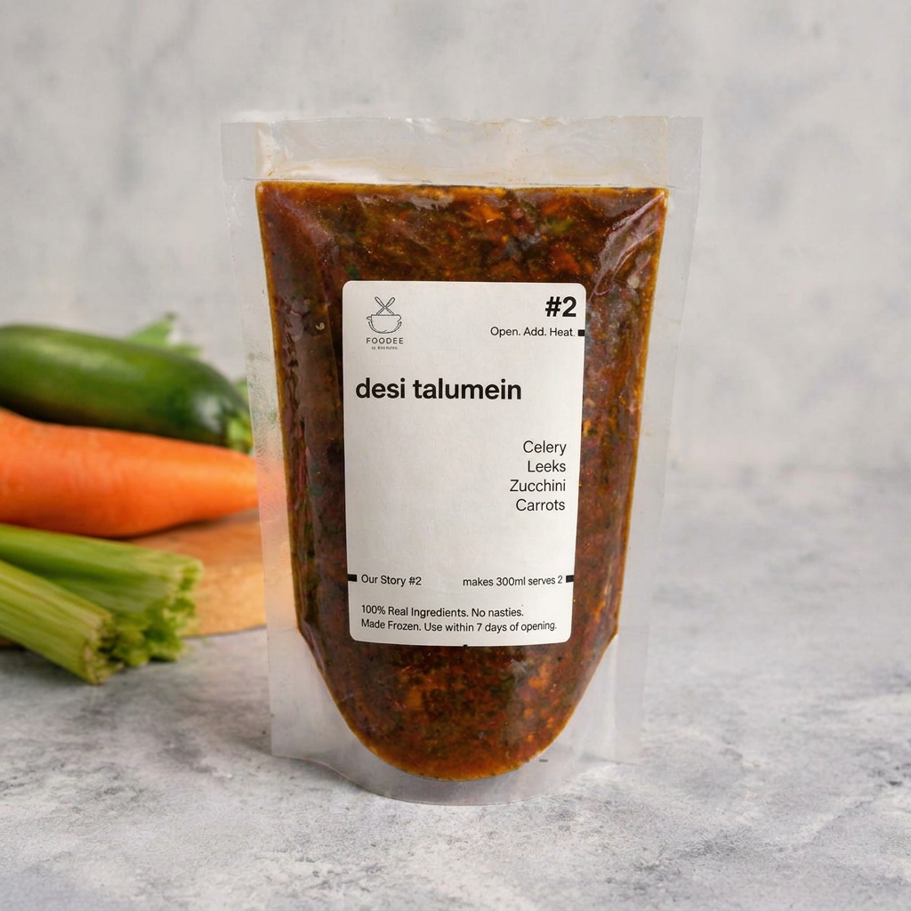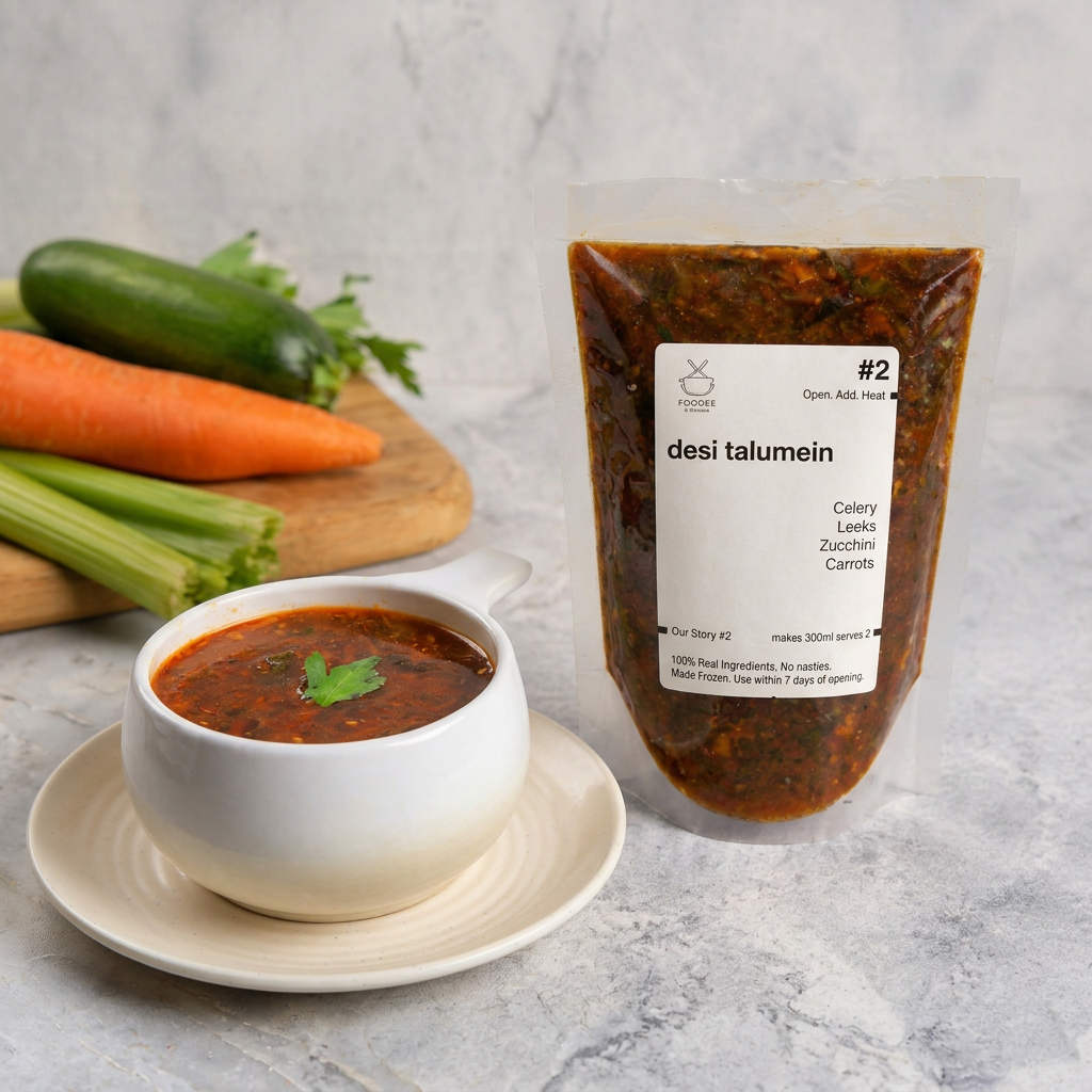 Experience the heartiness of our Ready to Cook Desi Talumein Soup. Frozen Soup Purees made with the freshest ingredients. The easiest and best soup that you can make at home. A delightful fusion of crisp celery, fresh leeks, vibrant zucchini and crunchy carrots, this flavorful blend promises to transport you to a culinary haven. Elevate your dining with the authentic taste of tradition in every spoonful.