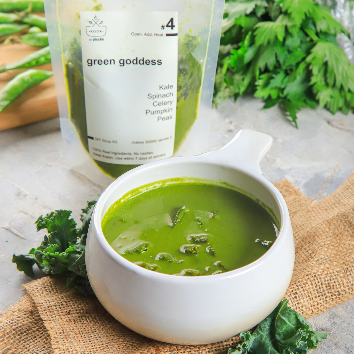 Unleash the vibrant goodness of nature with our Ready to Cook Green Goddess Soup. Frozen Soup Purees made with the freshest ingredients. The easiest and best soup that you can make at home.. A luscious blend of kale, spinach, crisp celery, hearty pumpkin, and tender peas, this soup is a celebration of wholesome flavors. Indulge in a bowlful of nourishment as you savor the essence of a verdant garden in every spoonful.