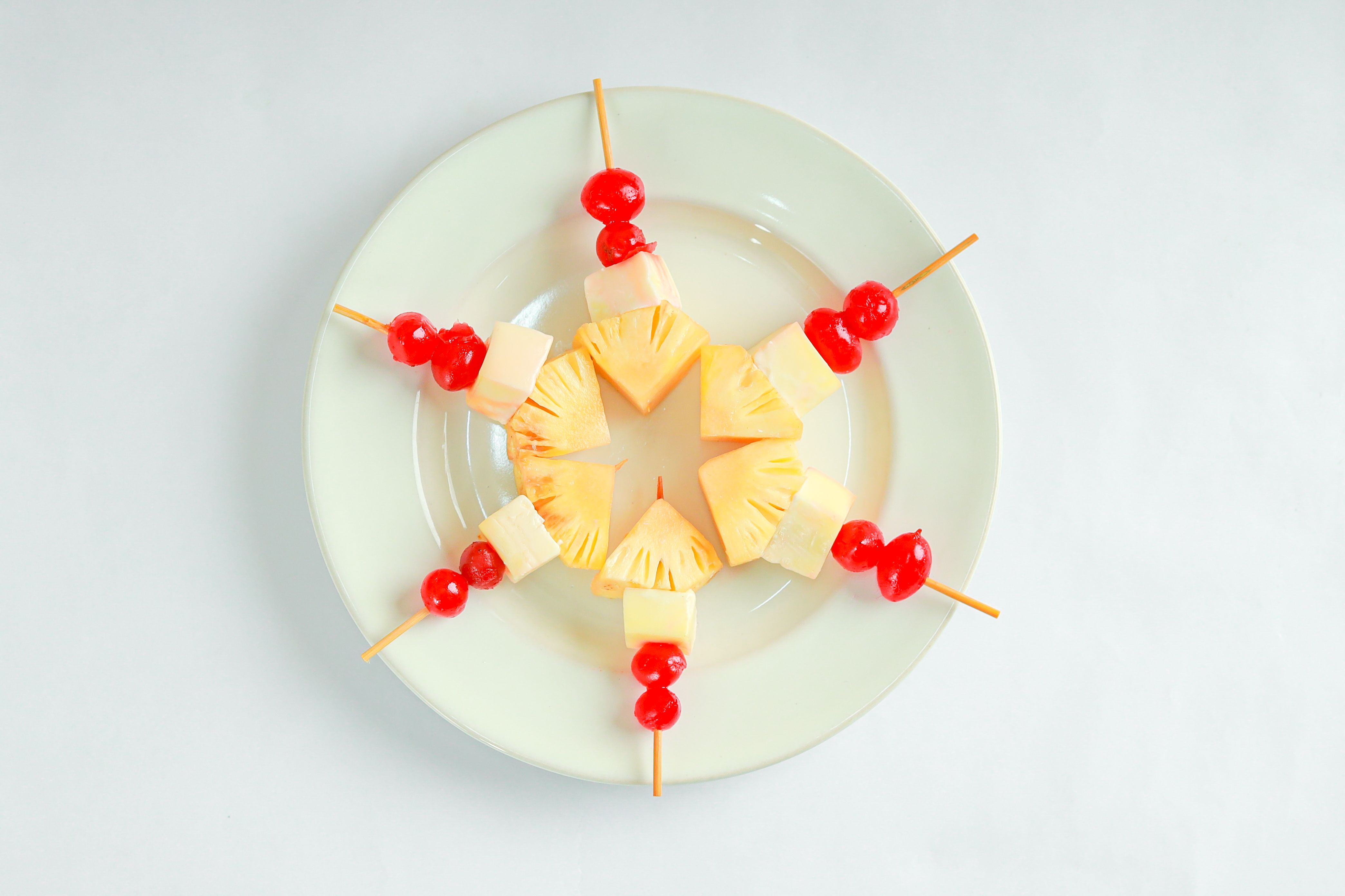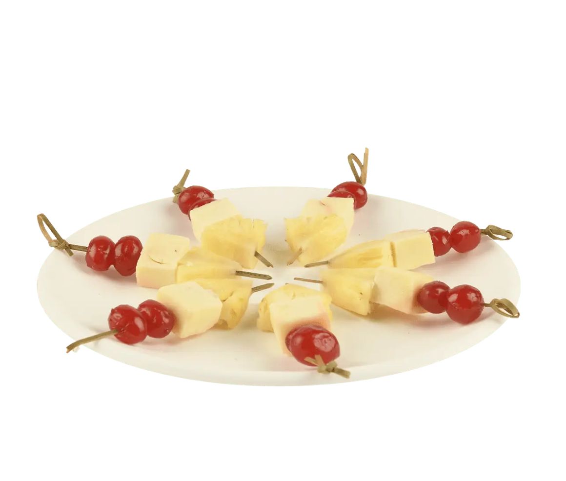 Cheese, pineapple, and cherry skewers are a delightful appetizer featuring a colorful combination of sweet and savory flavors. Each skewer typically includes cubes of cheese, chunks of juicy pineapple, and vibrant cherries, creating a visually appealing and tasty treat perfect for parties or gatherings.