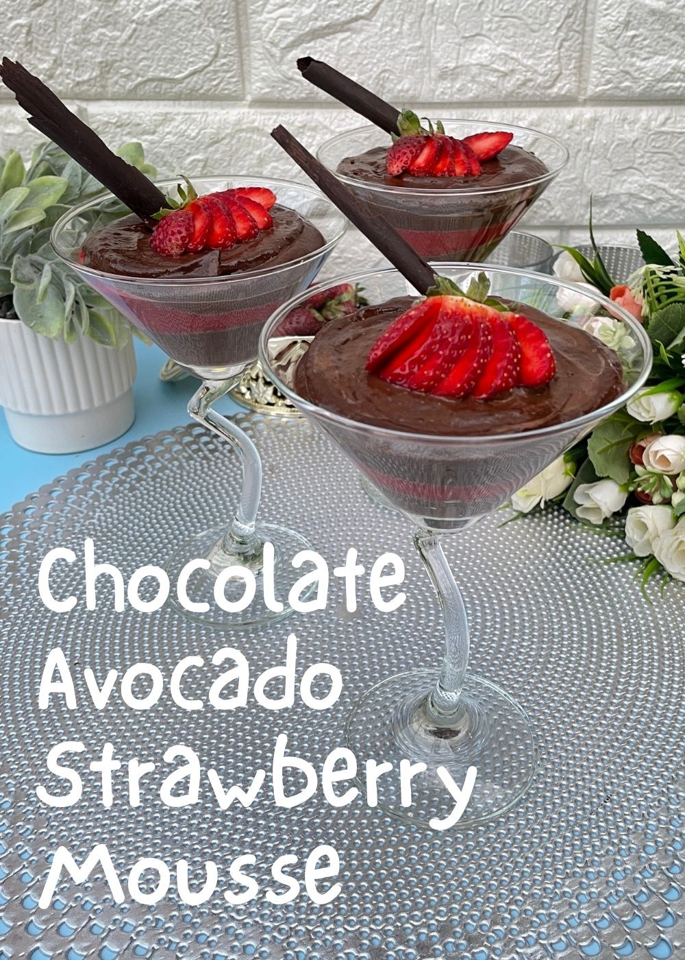 "I'm absolutely not kidding, I've found you the ultimate guilt free dessert that you will love berry berry much: CHOCOLATE AVOCADO STRAWBERRY MOUSSE 🍓😍