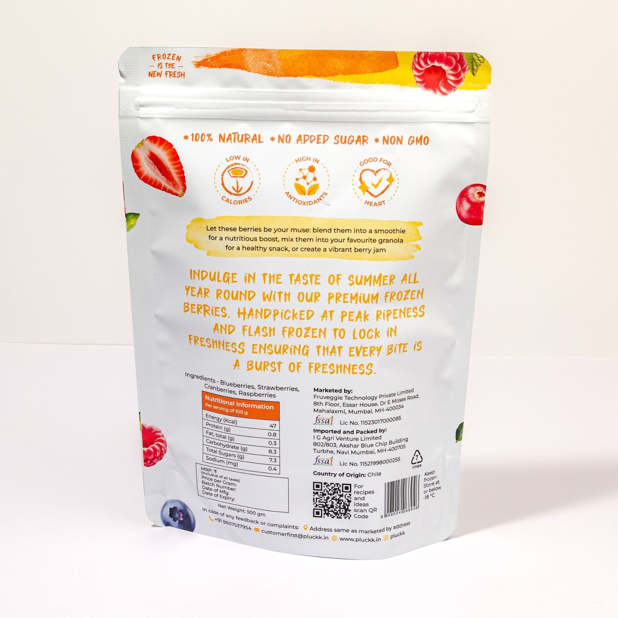 This dream team of strawberries, raspberries, cranberries, and blueberries is here to bring all the flavour vibes. Handpicked in Chile and flash-frozen at peak ripeness, they offer the perfect blend of sweet, tangy, and juicy flavours that provide the ultimate refreshment. Blend into your smoothies, brighten up your salads, or add that WOW! factor to your desserts. Whether you’re snacking on the go or crafting something in the kitchen, our Frozen Mixed Berries are here to keep things fresh and fun with a medley of flavours!