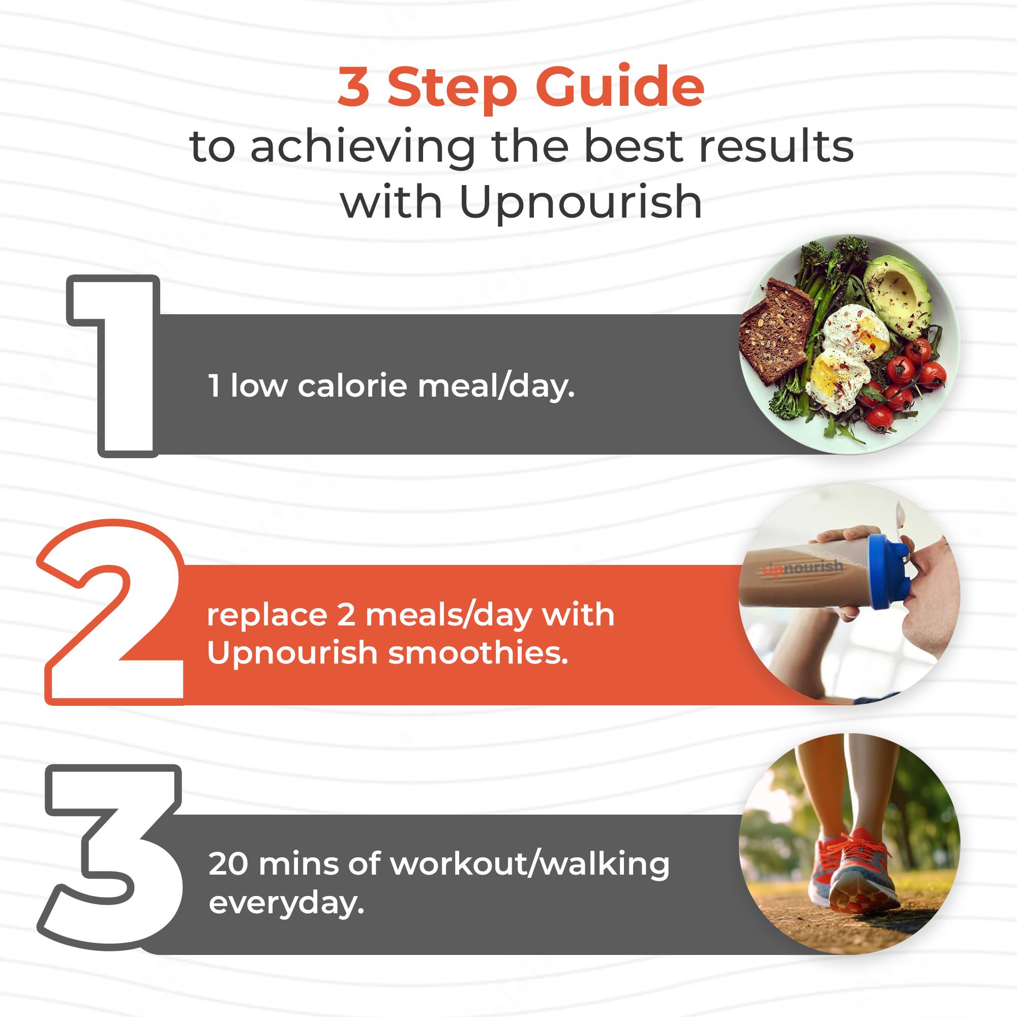- Dinner: Balance your daily calorie intake with low-calorie meal replacements.