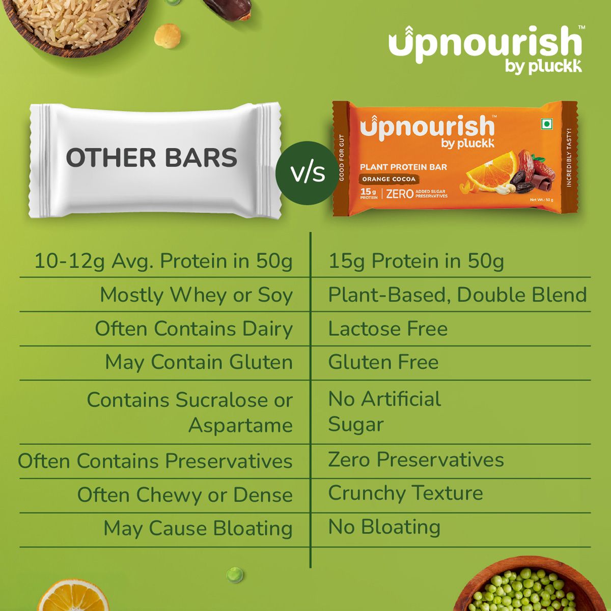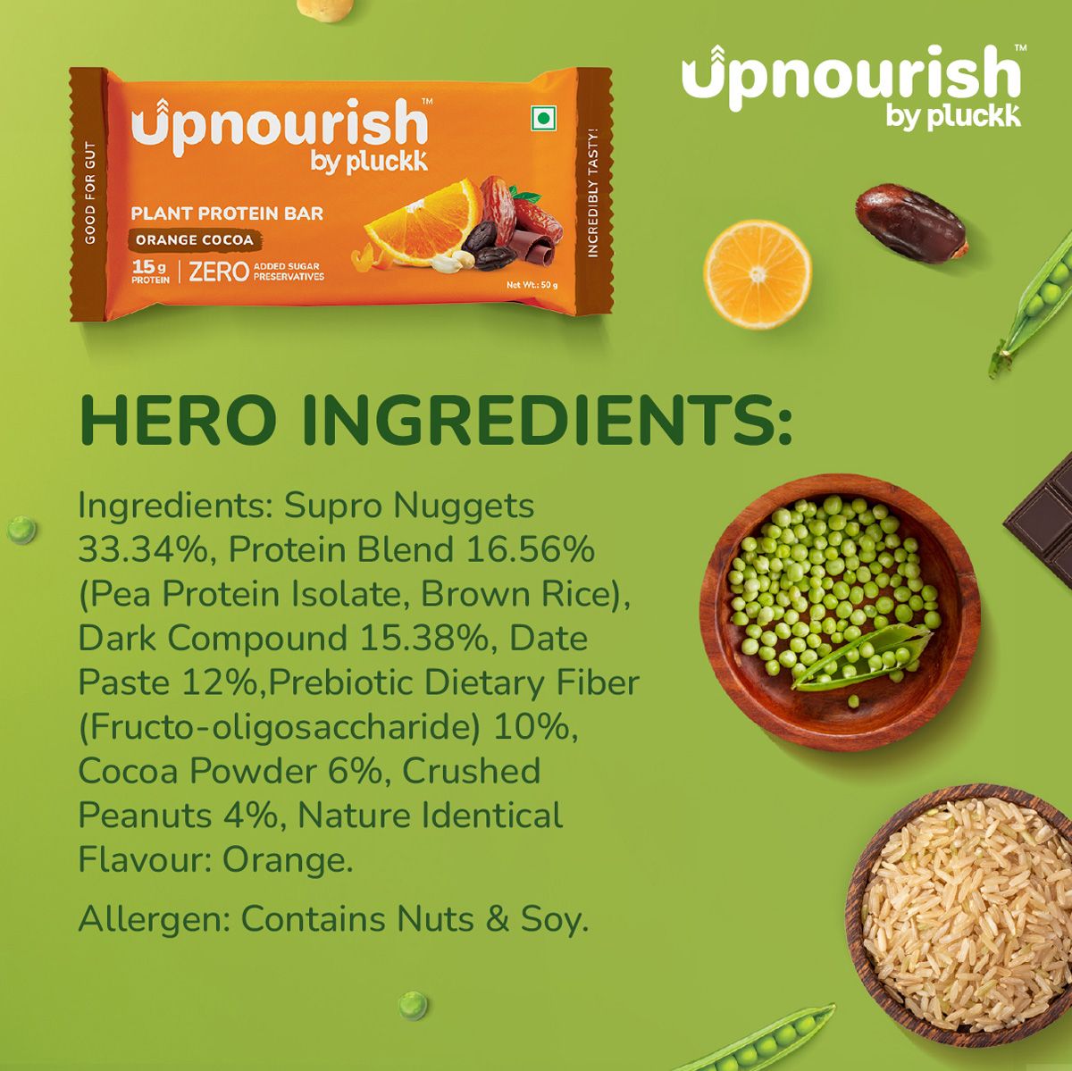 - 15g high-quality plant protein from peas and brown rice