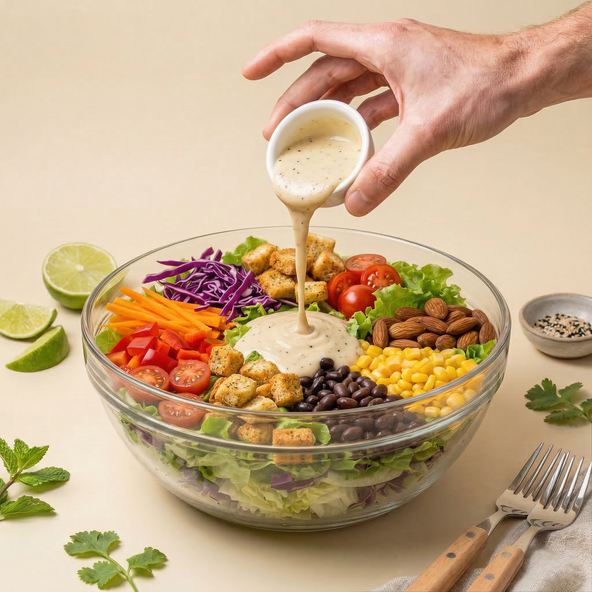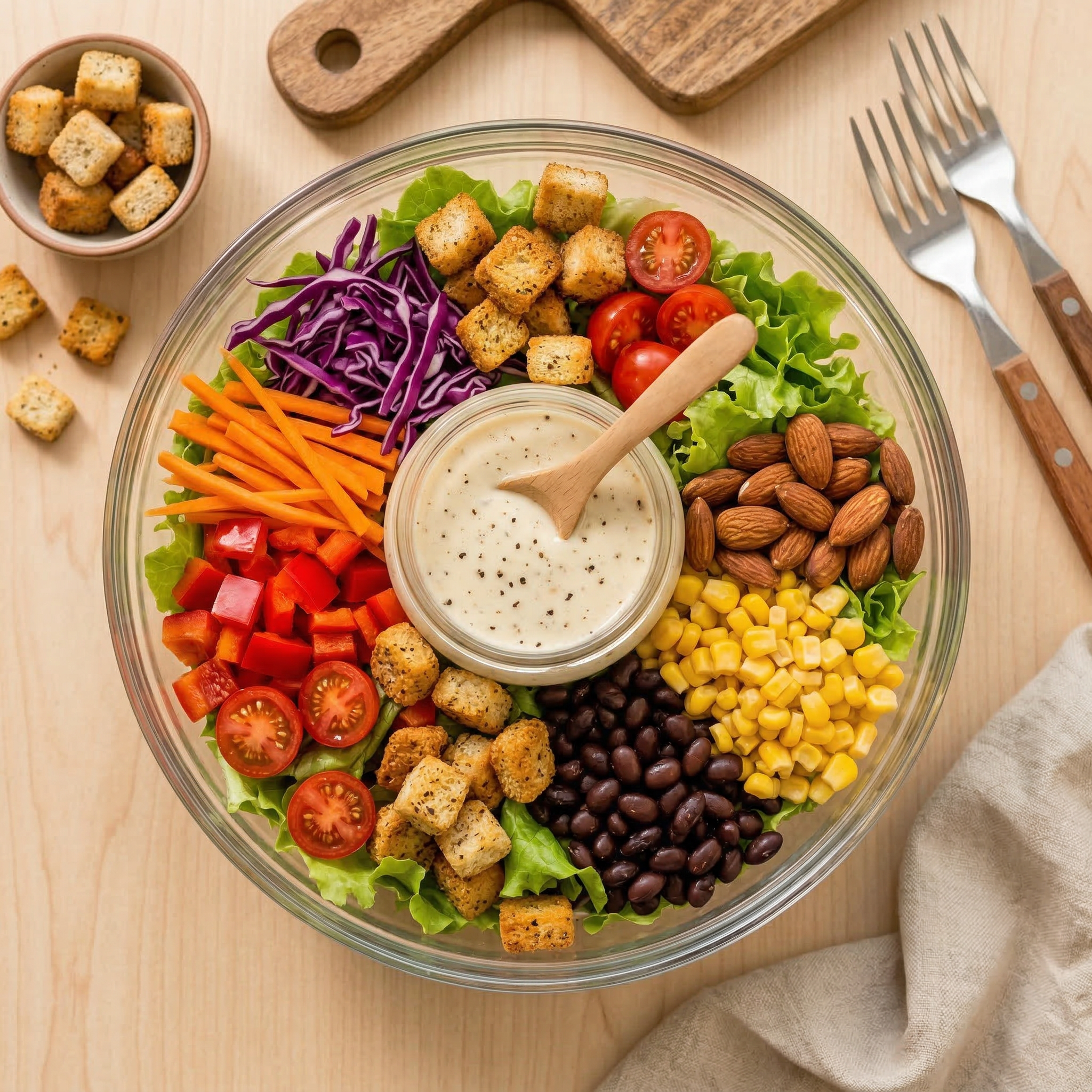 With crunchy greens, protein-rich beans, sweet corn, and classic Caesar flavours, this salad brings together freshness, texture, and familiar comfort in every bite.